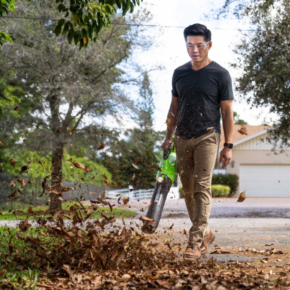 The Greenworks G40ABII is a high-performance yet lightweight leaf blower for small to medium-sized areas. Powered by an advanced 40V lithium-ion battery, it combines compact design with strong performance. As part of the 40V family, the battery is interchangeable with other tools, offering total flexibility and convenience. The ergonomic design and balanced weight distribution make garden cleanup effortless.