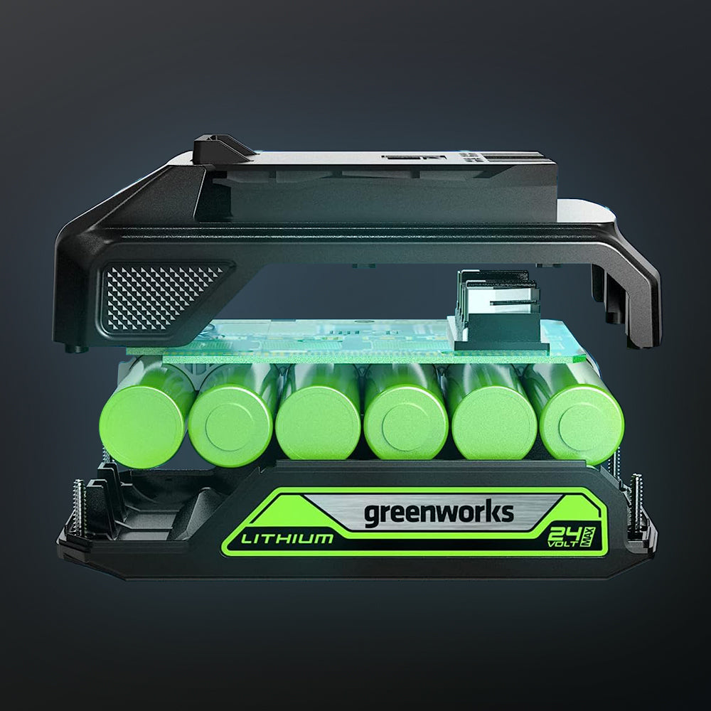 The Greenworks G24B2 is a robust, lightweight 24V 2Ah lithium-ion battery. Featuring the latest Lithium-Ion technology and integrated LED power indicator clearly showing the power level and when charging is required. Compatible with all 24V garden and power tools for total convenience.