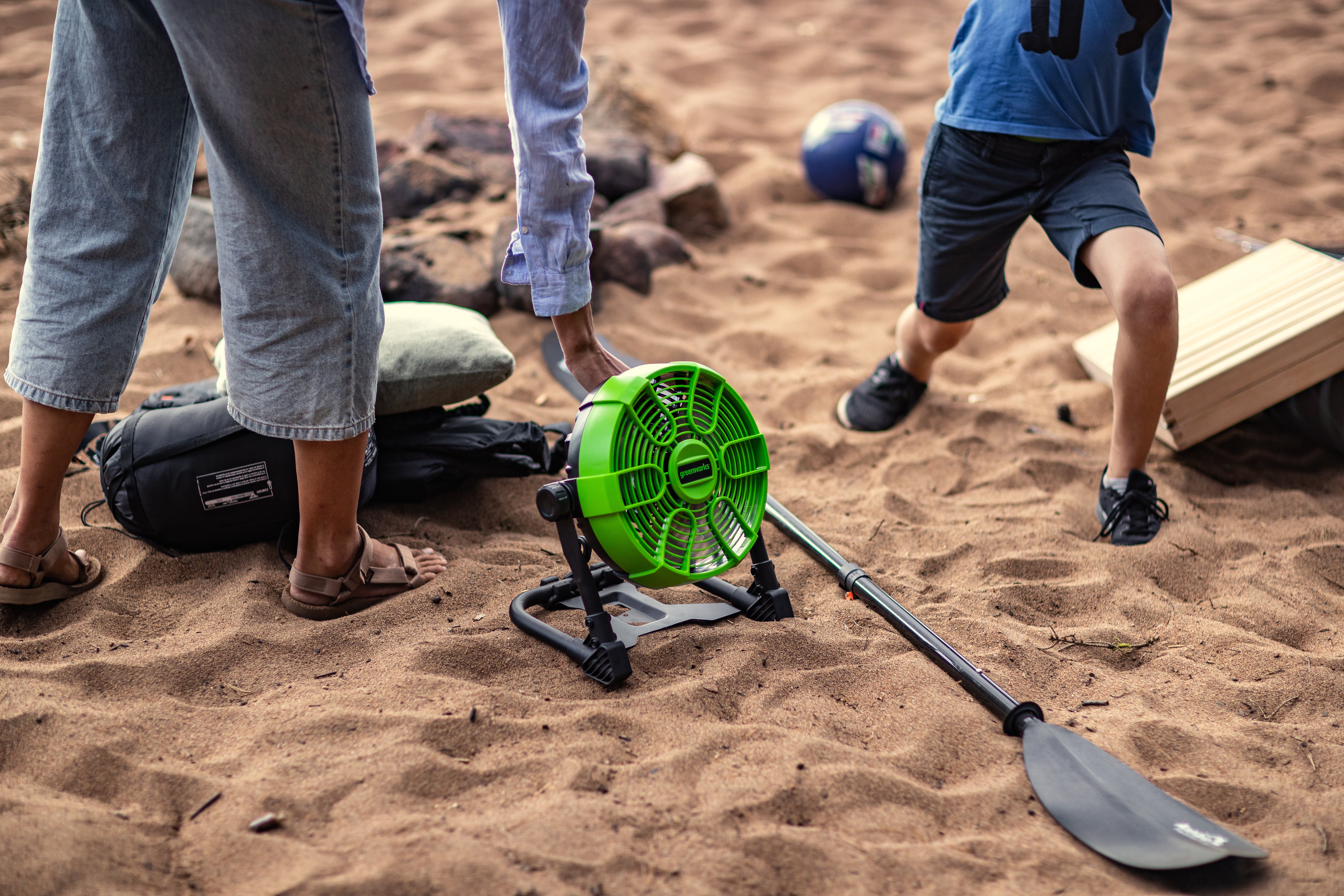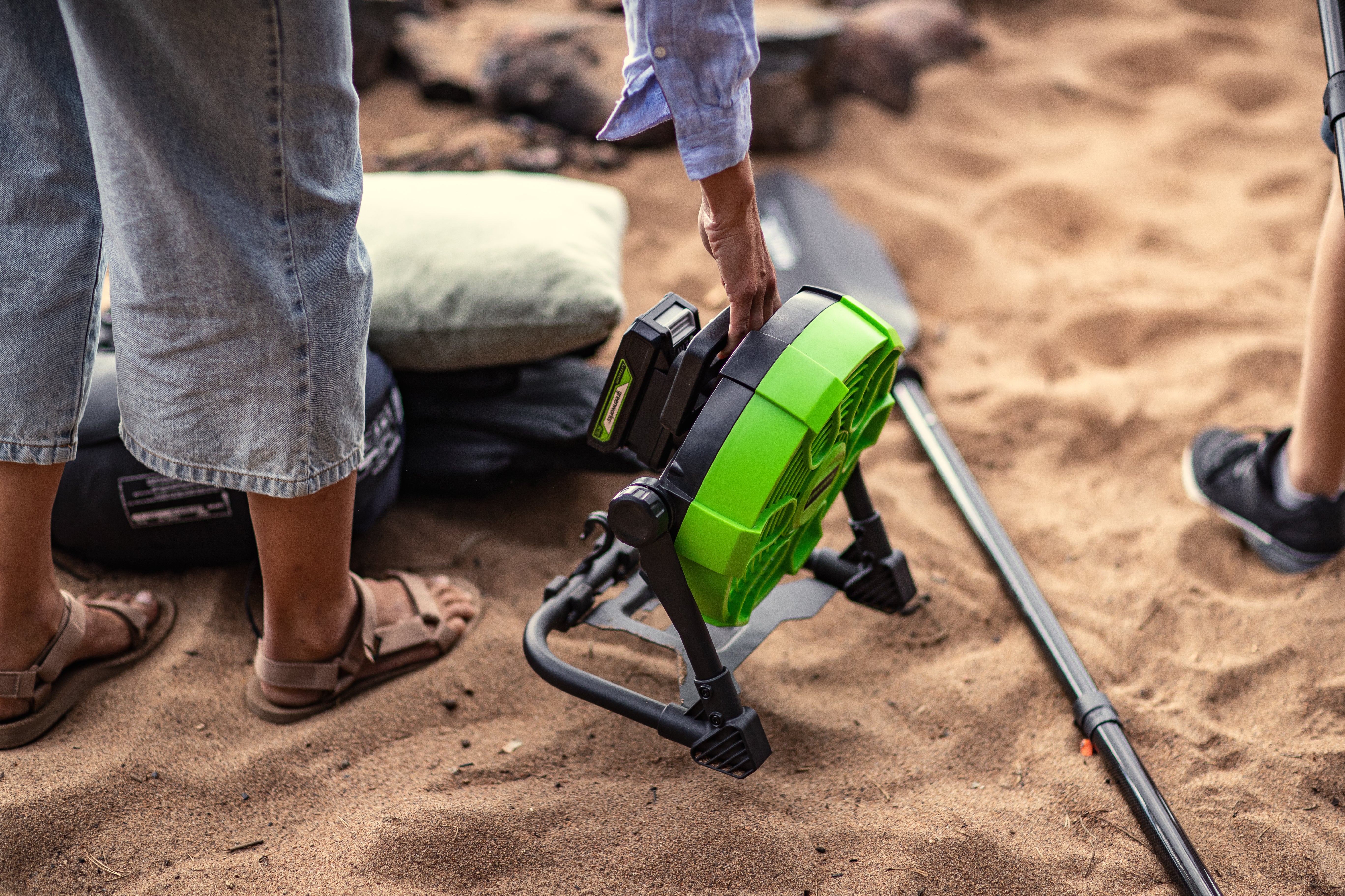 The Greenworks G24FAN is a powerful yet lightweight 24V fan, perfect for job sites, outdoor activities, or home use. With a compact design and easy transport, it provides air circulation wherever you need it. Featuring five speed settings and a 360° rotating head, it allows for precise airflow direction. The hybrid power option lets you run it on either battery or electric power, ensuring continuous operation when needed.