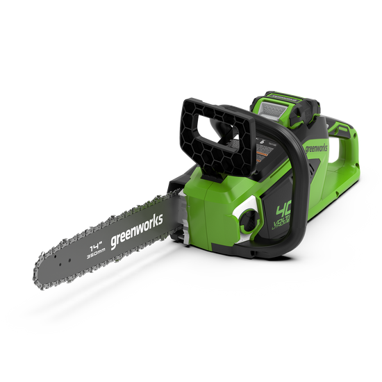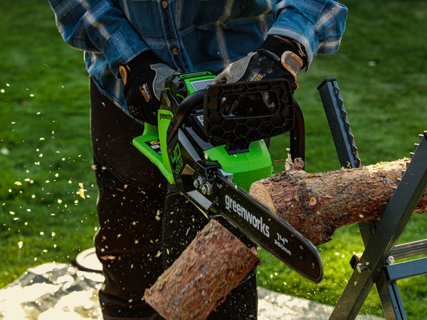Our Greenworks 40V chainsaw makes gardening and construction work simple and efficient. With a 12m/s chain speed and a 35cm blade, the GD40CS15K2x ensures fast cutting. The chain can be tensioned easily without special tools. For added safety, the saw features a hand guard.