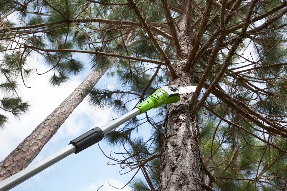 Working at different heights The Greenworks G40PS20's light weight and compact design makes it easy to work in your garden with the pole saw. The easily adjustable 3-piece shaft allows you to reach branches with ease.