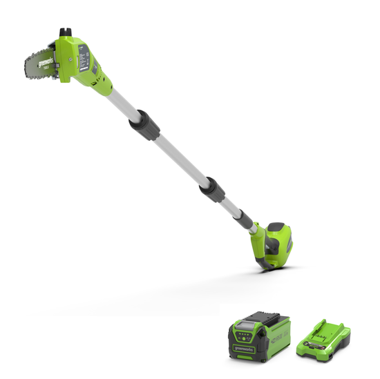 Greenworks has developed the G40PS20, a lightweight 40V pole saw for pruning branches in the garden. Powered by a state-of-the-art 40 V lithium-ion battery, this pole saw offers impressive performance despite its light weight. For optimal comfort, no fuel or electric cables are required - simply insert the battery and you're ready to go.
