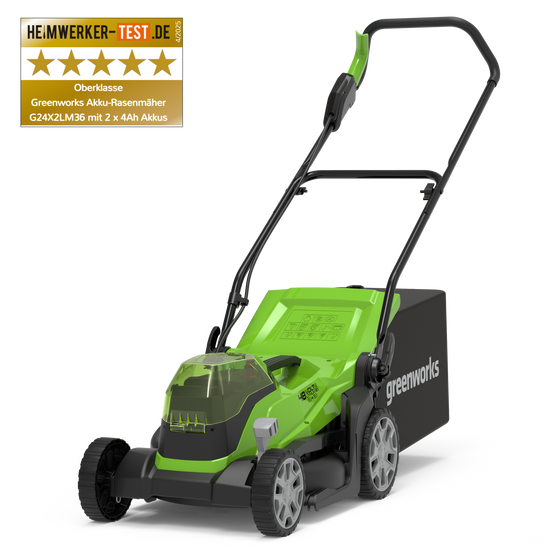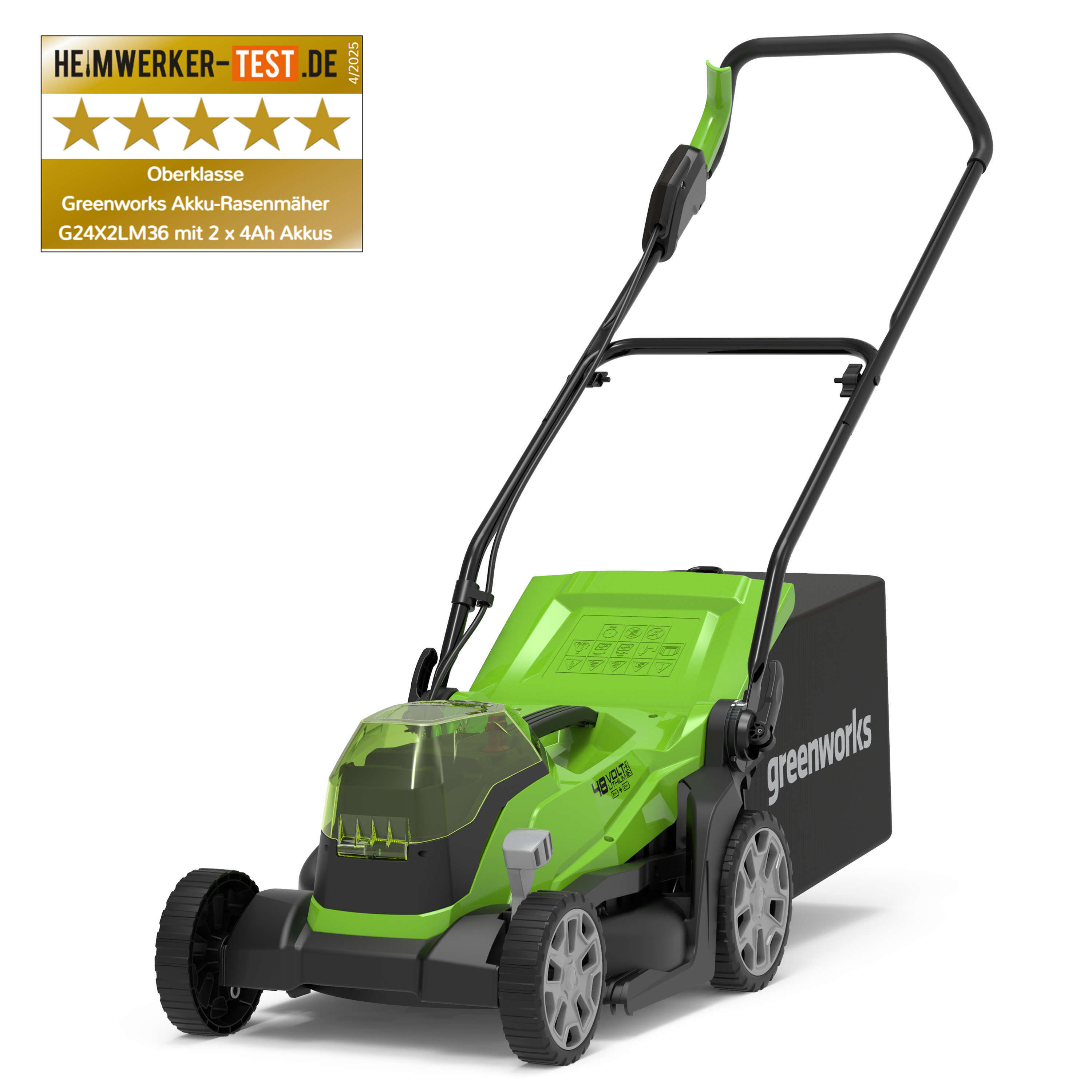 The Greenworks G24X2LM36 is a highly versatile lawnmower designed for small lawns. Powered by an advanced double battery system the machine offers 48V performance using 2x24V batteries, as part of the 24V family, the battery can be used in any of the other tools available, for total flexibility and convenience.