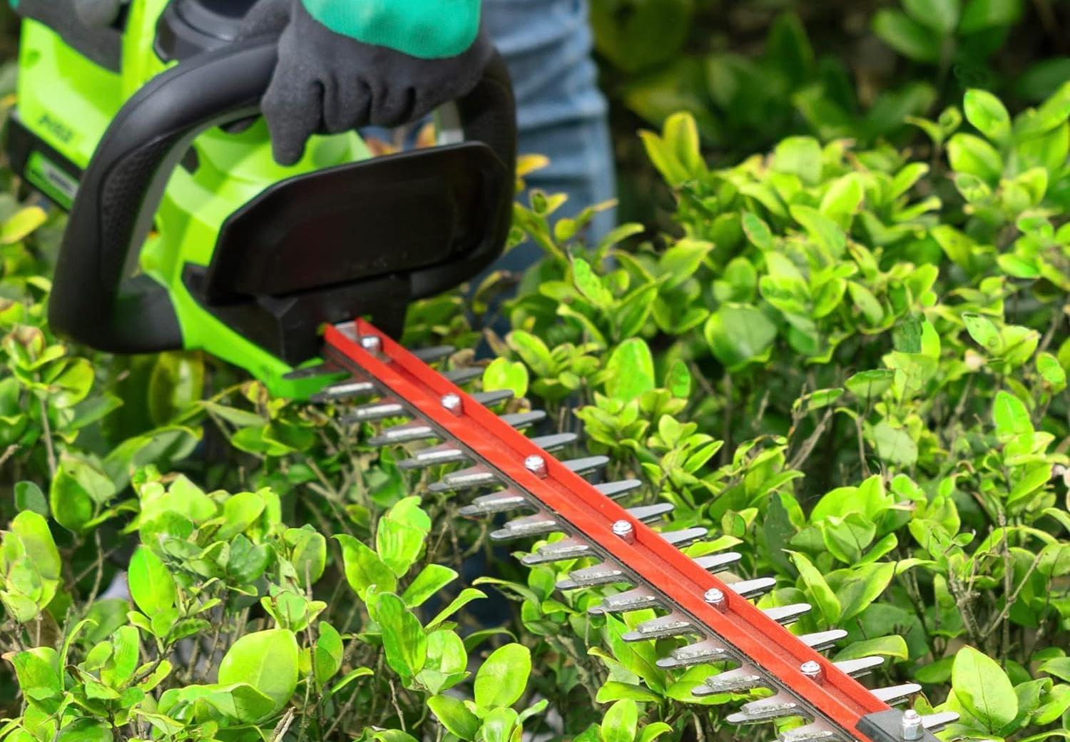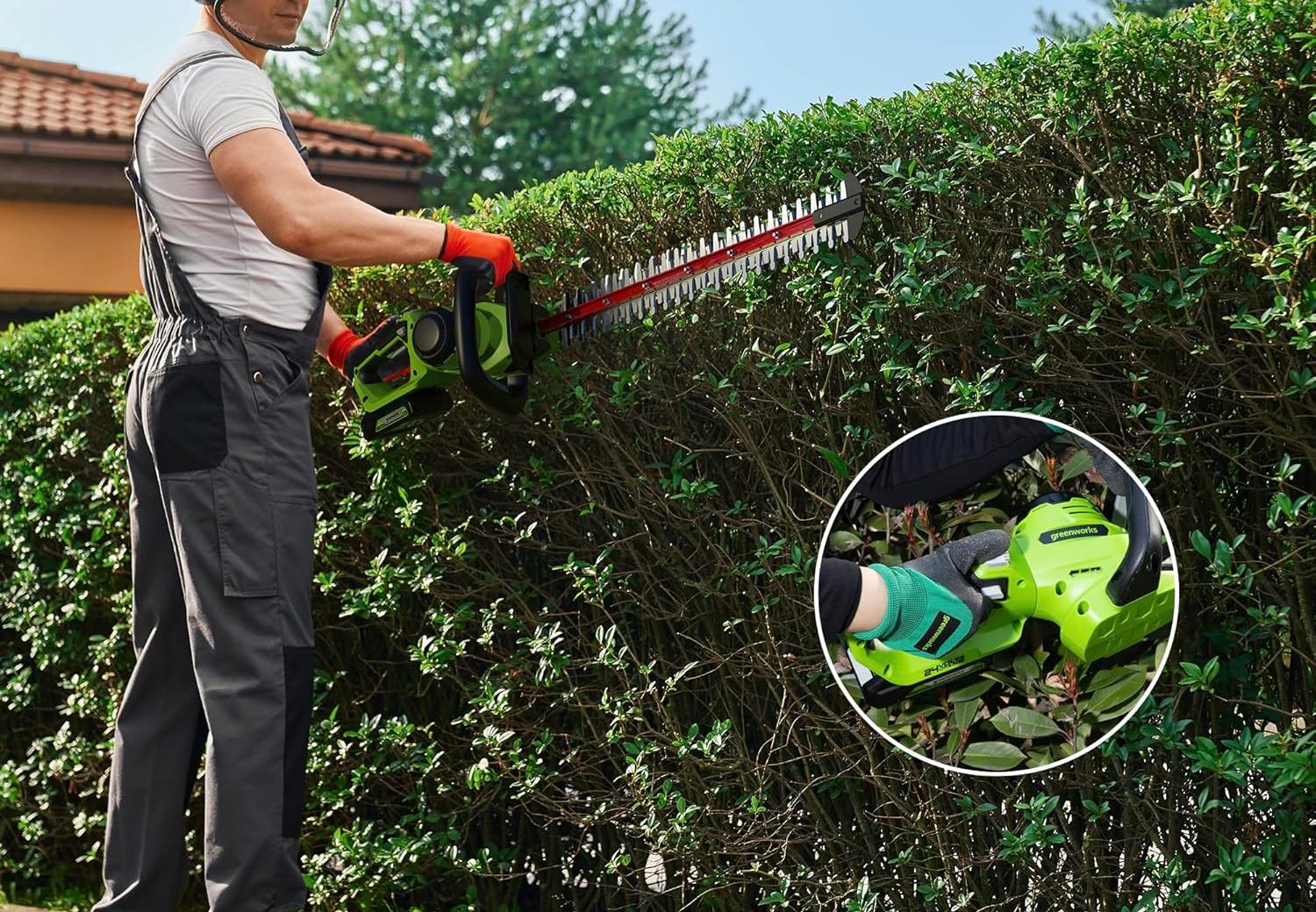 No cords, no petrol – just insert the 24V battery and start trimming. The G24HT70 features a rotating rear handle and a full-length front trigger, making it easy to trim hedge sides and tops from any angle. As part of the Greenworks 24V system, the battery is compatible with a wide range of garden and power tools