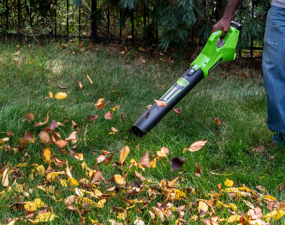 The Greenworks G24ABII is a lightweight and powerful 24V leaf blower, ideal for clearing leaves and debris around your home and garden. Powered by an advanced 24V lithium-ion battery, it delivers strong performance with total cordless freedom. Simply insert the battery and start blowing.