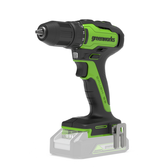 The Greenworks GD24DD35 is a lightweight and robust 24V drill driver, perfect for home and DIY tasks. Powered by an advanced 24V lithium-ion battery, it delivers strong performance in a compact design. Featuring 2 gears, a variable speed trigger, and 18+1 operation settings, it provides optimal control for any job. The tool-less chuck allows quick bit changes, while the integrated LED light ensures clear visibility. With 35Nm of torque, this drill is ideal for drilling into wood and walls.