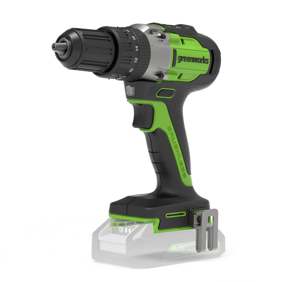 The GD24DD60 delivers 60Nm of torque with 2 gears and 26+1 settings for precision. Its tool-less chuck allows quick bit changes, and the LED light enhances visibility. Cordless and compatible with all Greenworks 24V tools.