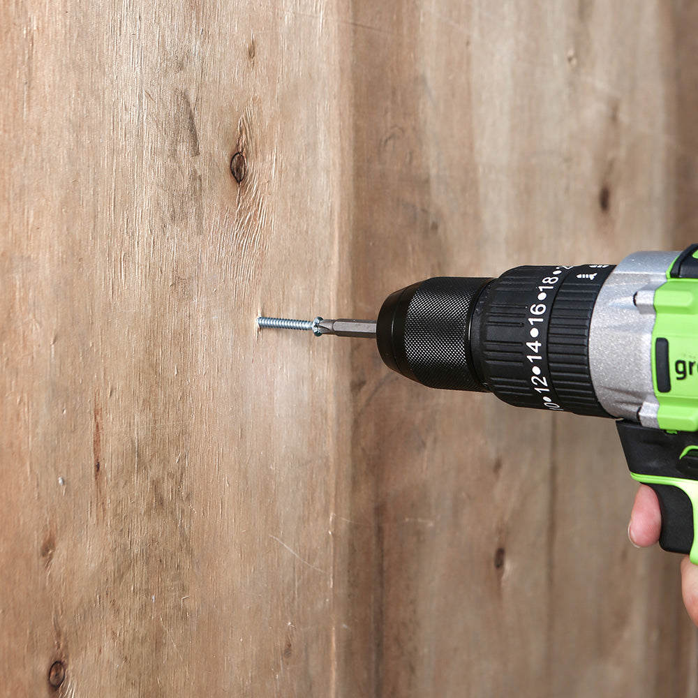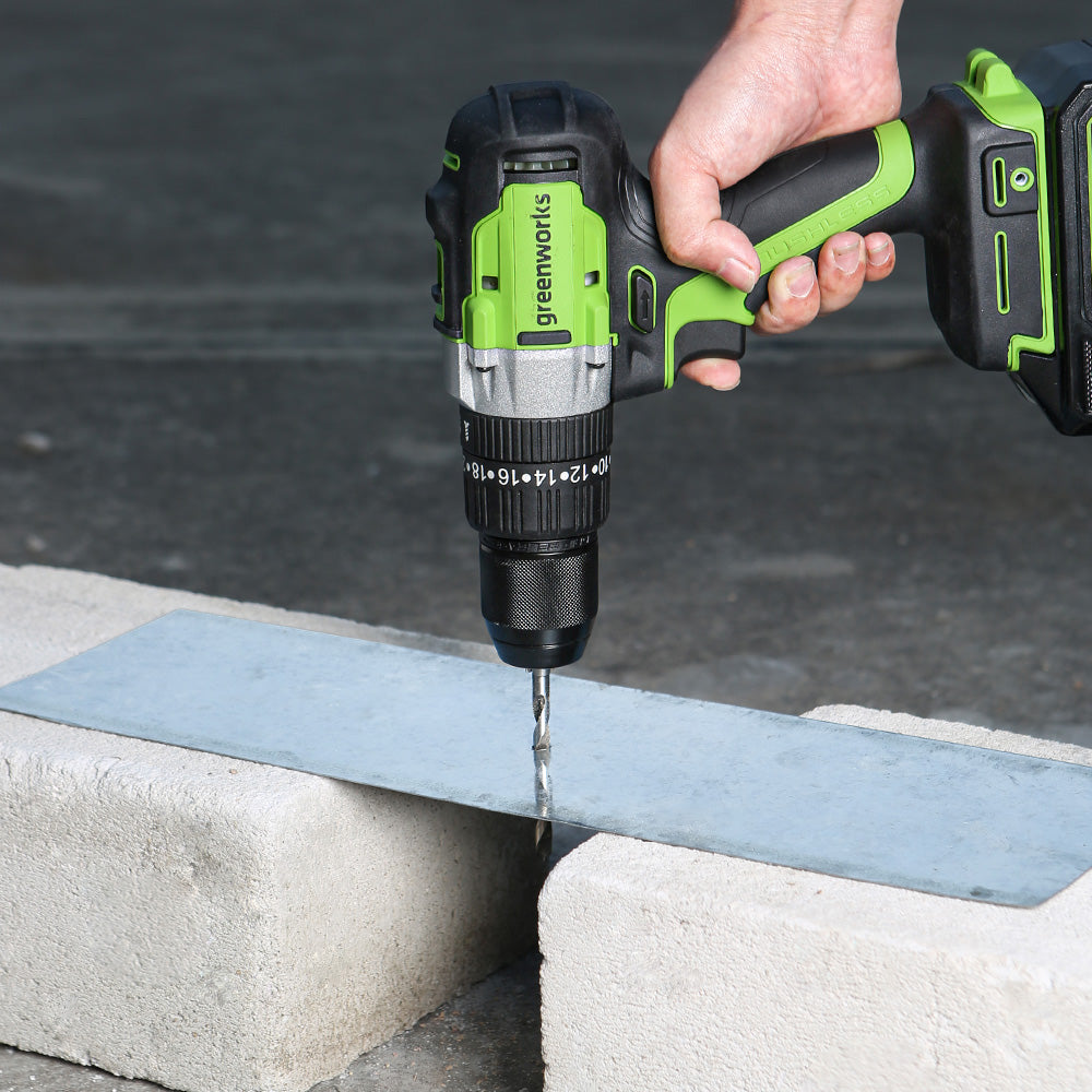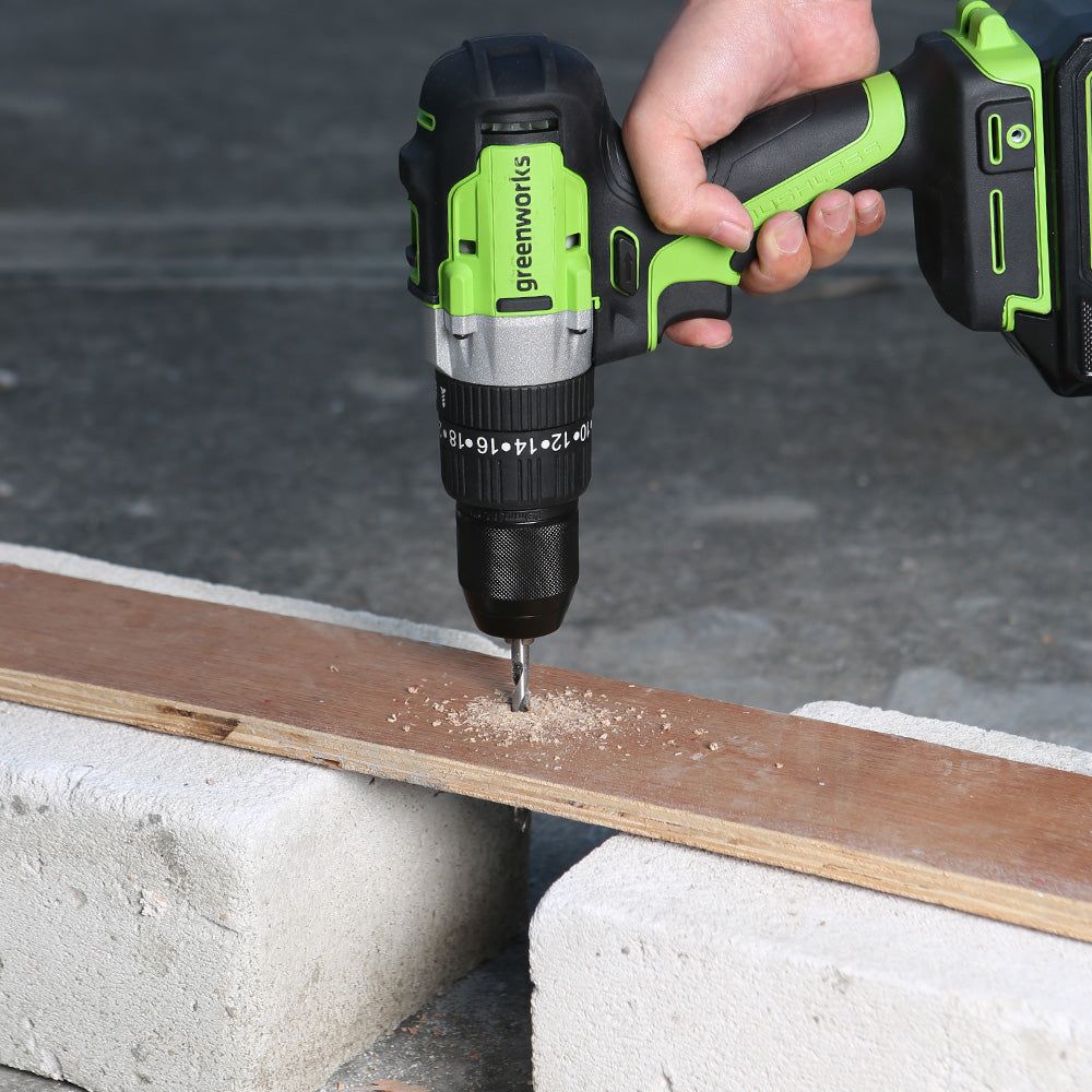 The GD24DD60 delivers 60Nm of torque with 2 gears and 26+1 settings for precision. Its tool-less chuck allows quick bit changes, and the LED light enhances visibility. Cordless and compatible with all Greenworks 24V tools.