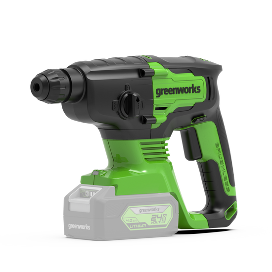 The Greenworks GD24SDS2 is a powerful yet lightweight 24V hammer drill, perfect for home and DIY tasks. Its advanced 24V lithium-ion battery ensures high performance with no need for electric cables. With a variable speed trigger and a 4-in-1 function—drilling, hammering, chiseling, and vario lock—the GD24SDS2 offers total versatility. The quick-release SDS chuck allows for effortless tool changes.
