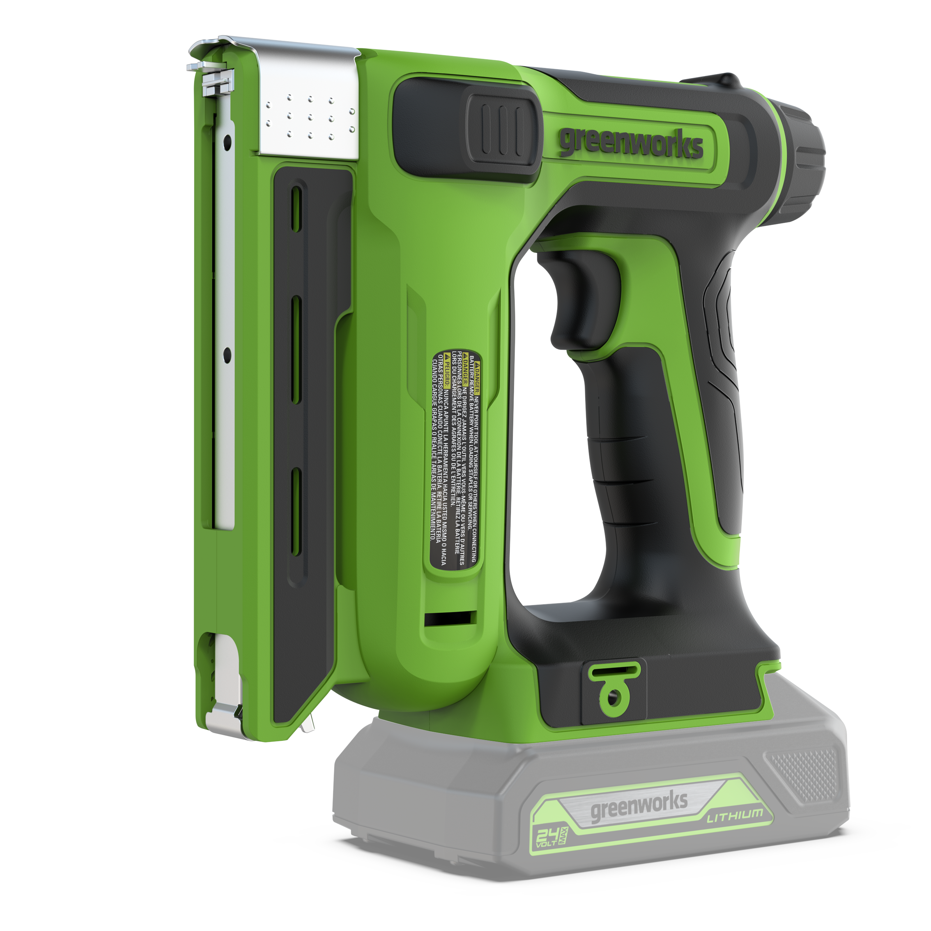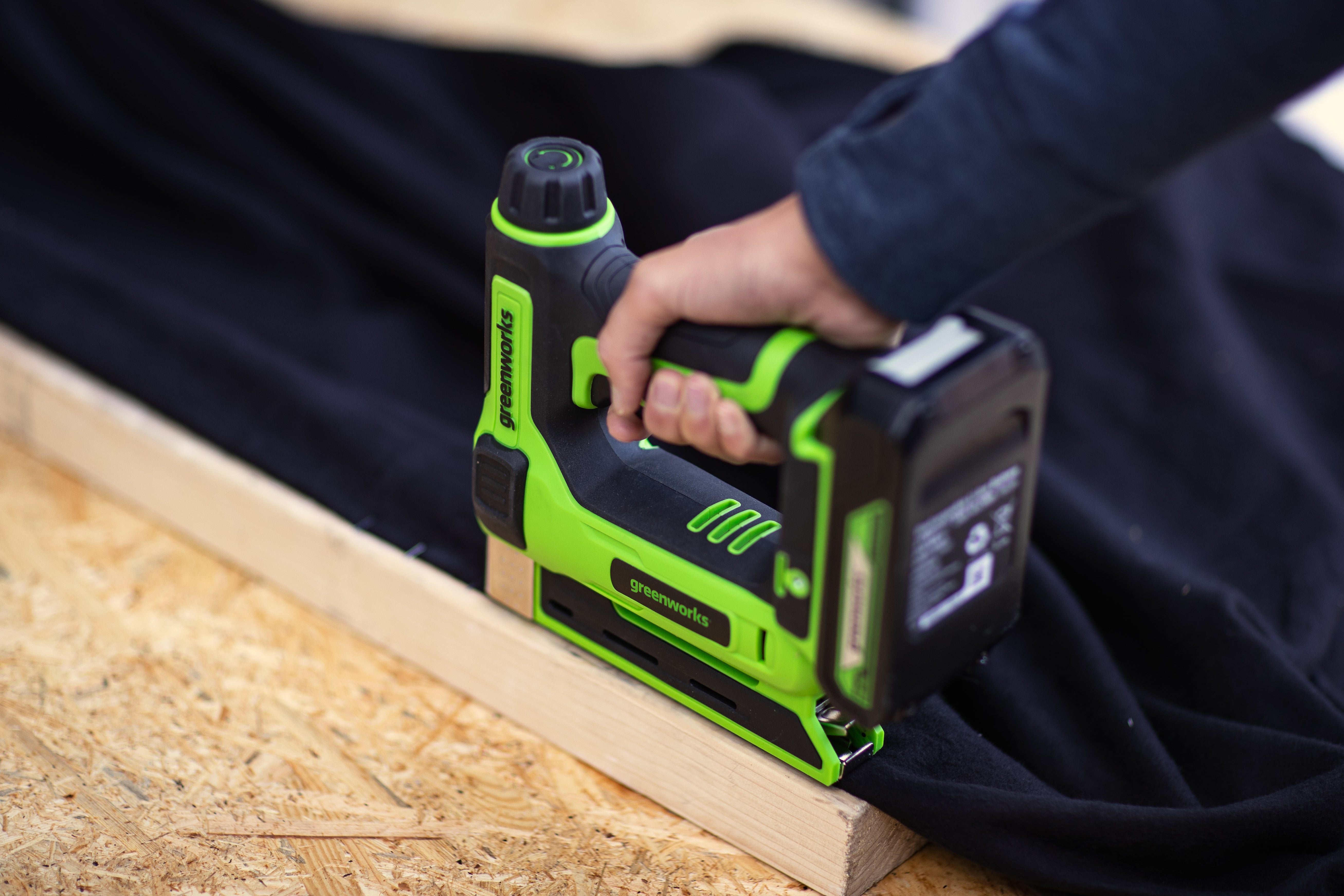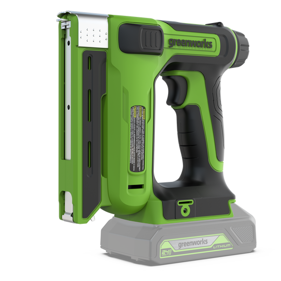 The Greenworks G24CS10 is a compact and efficient 24V cordless stapler, ideal for home and DIY projects. With a magazine capacity of 100 staples and a staple speed of 60 pieces per minute, it ensures fast and precise fastening. The adjustable depth control knob allows easy customization for different materials, while the drive force indicator ensures consistent performance. Lightweight at just 1.35 kg, it provides comfort and ease of use for extended projects.